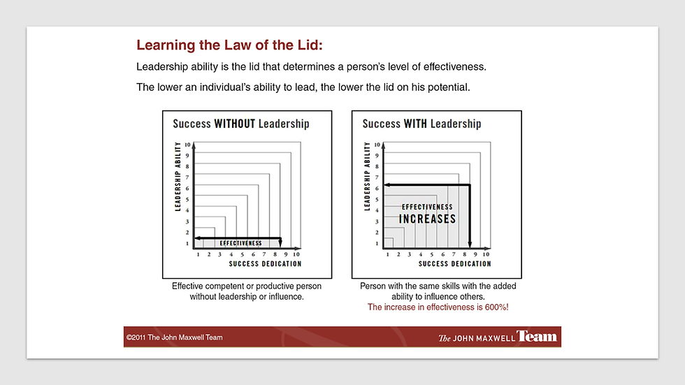 Whatever your Success Dedication is, there is room for growth even if you've achieved a certain level of success. The difference in leadership ability equates to the amount of value you've added to others. By raising your Lid, you multiply the effect of success and expand it those above, below and beside us. You can overflow your jar with success by adjusting your definition of success from impact on self to impact on others as well as understanding the compounding effect of leadership ability.